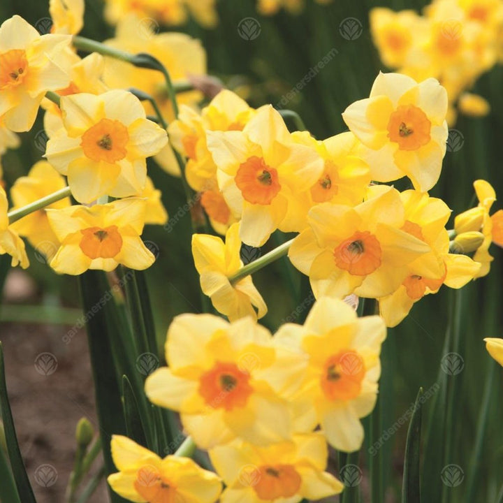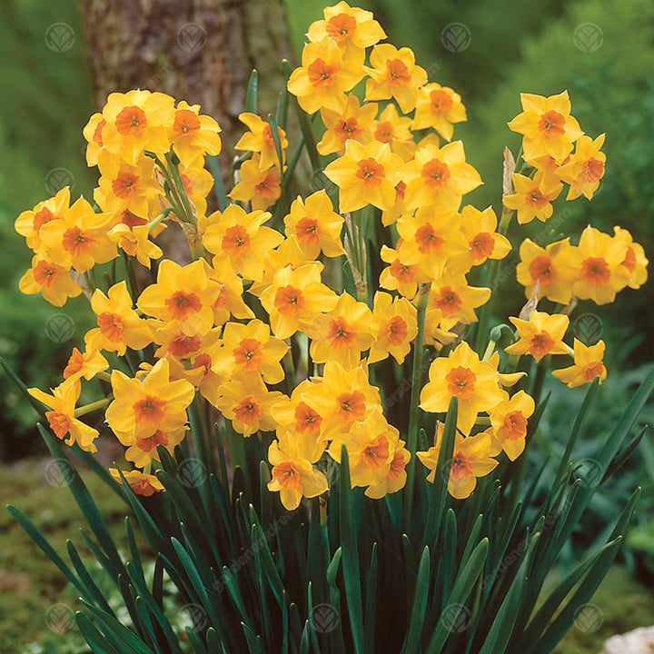 Golden Dawn is part of the division 8 daffodils, these scented, multi-headed flowers have parakeet yellows in their petals and electric oranges in their stout, open bowl-shaped cups. Typically, anywhere from 3 to 15 blooms can appear on a single stem