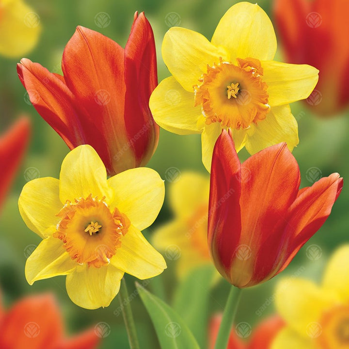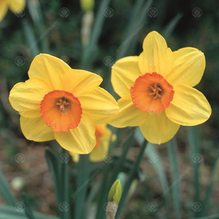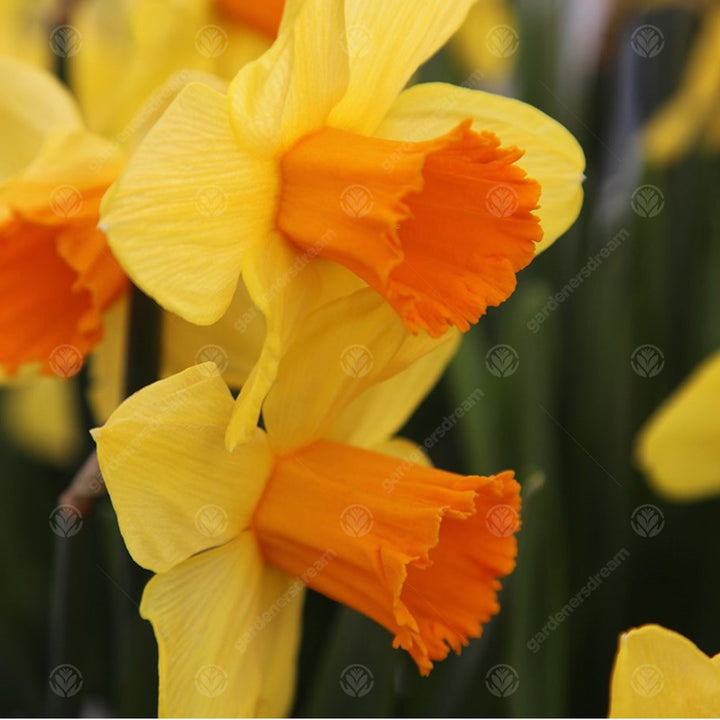 The flowers are generally yellow, orange or white with either uniform cups and petals or contrasting colours.