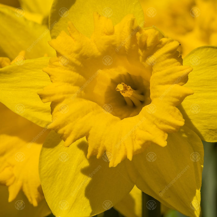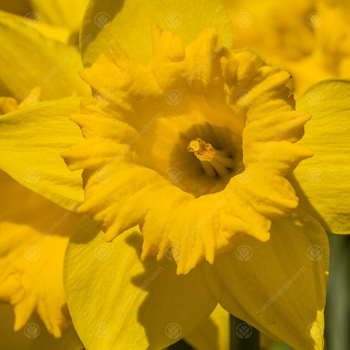 King Alfred has a deep, central cup of a spectacular yellow trumpet with a rippled and curled mouth. The surrounding petals are matched in yellow colour, but slightly less intense than that of the corona. They, too, exhibit a slight curl and rippling along their edges.