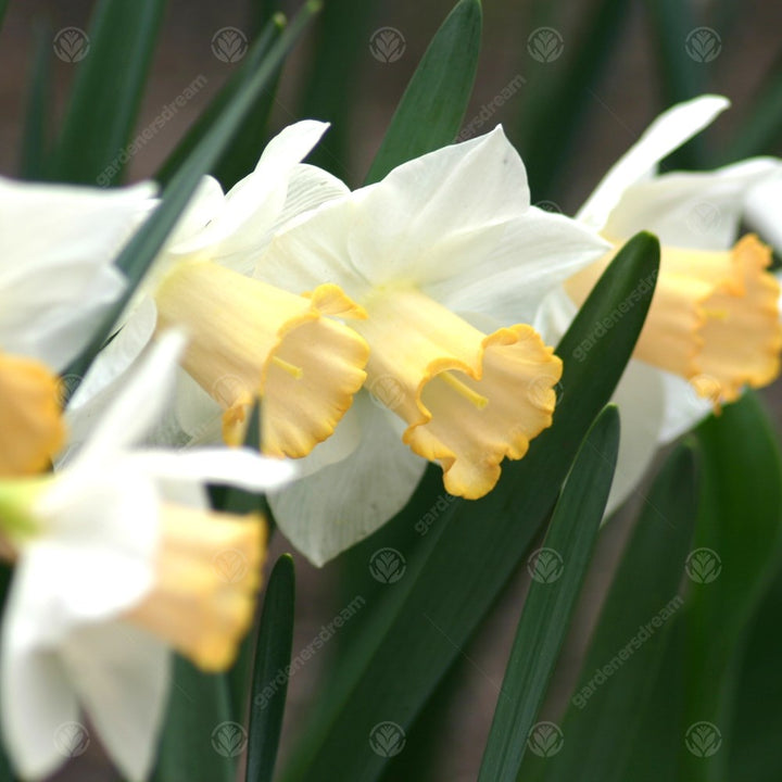 The flowers are generally yellow, orange or white with either uniform cups and petals or contrasting colours.