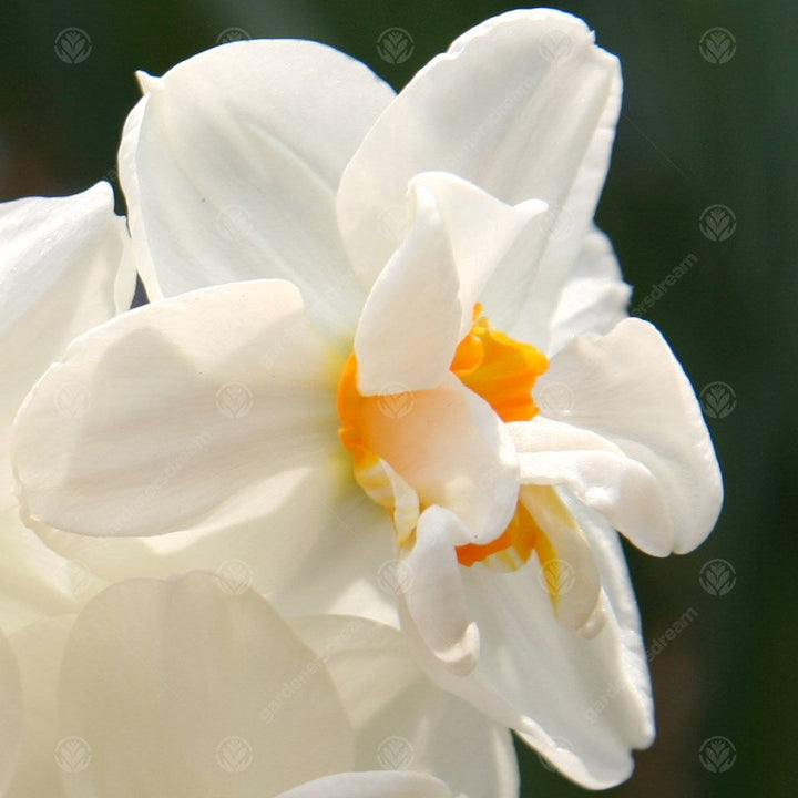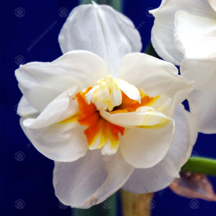 Sir Winston Churchill is a beautiful specimen from the division 4 daffodils. There are four blooms typically on the end of a stem. The individual blooms themselves are intricate patterns of several central petals folding and intersecting one another along with orange-coloured segments of the corona. The exterior petals are more uniformly flat and broad.