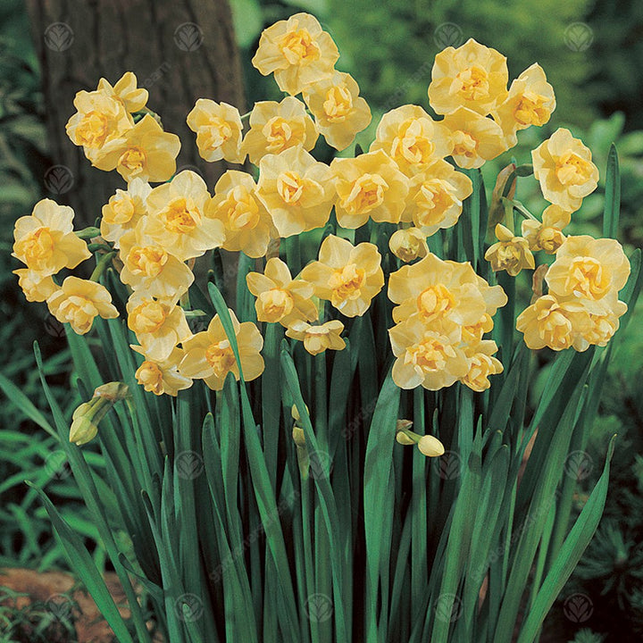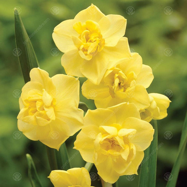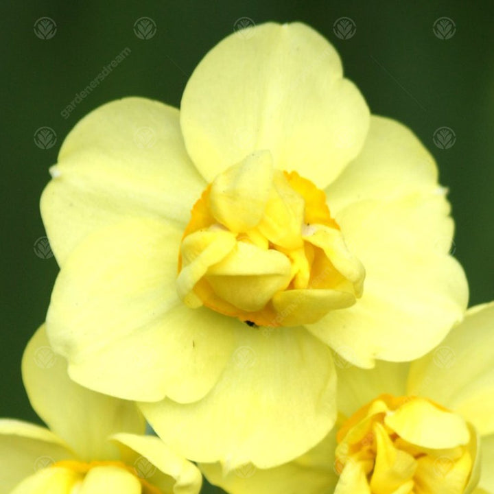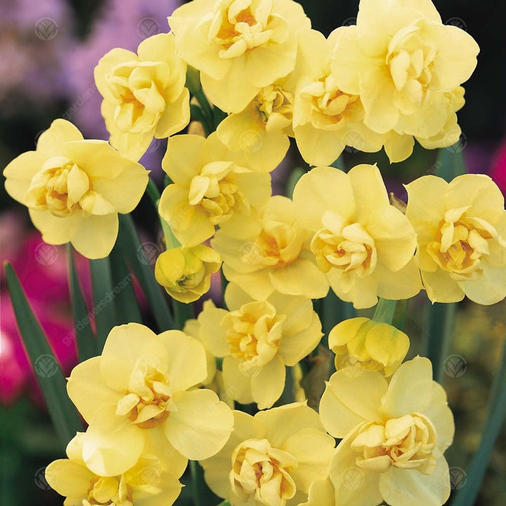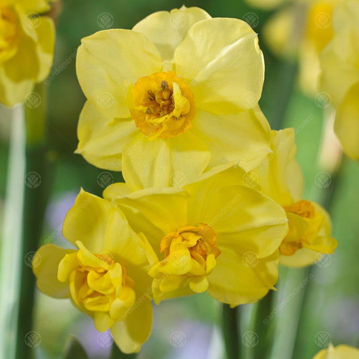 Yellow Cheerfulness is a classic yellow beauty that blooms with three to four flower heads per stem and multiple blooms appear clustered together. The corona matches in colour to the surrounding petals, but is more intricate and complex. The similarly-coloured exterior petals are delicate and lay mostly flat while gently overlapping one another.