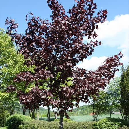 This striking tree is a robust choice with dramatic, deeply lobed crimson-purple leaves that make it a handsome specimen for any garden. In early spring, clusters of deep yellow flowers, tinged with red, bloom before the foliage appears, adding seasonal interest. In autumn, the foliage transforms with vibrant colours, creating a beautiful display.