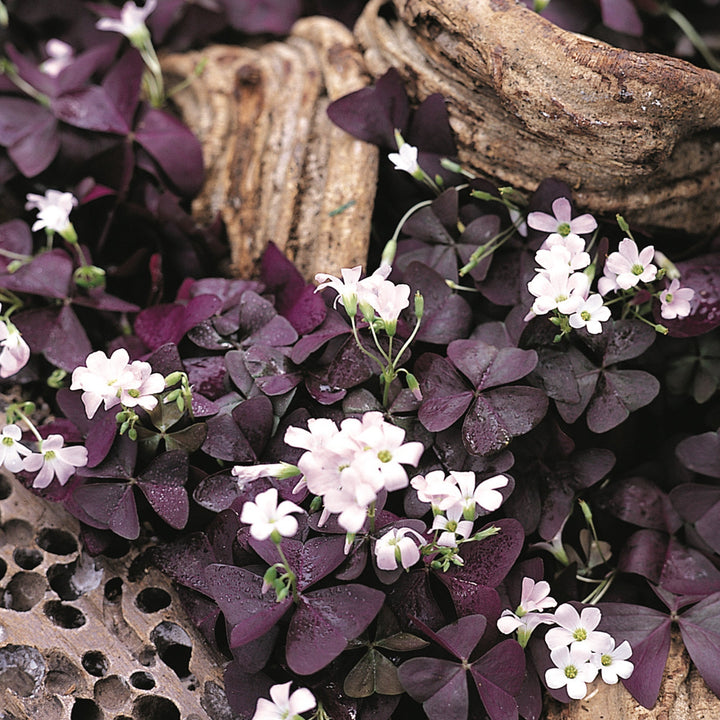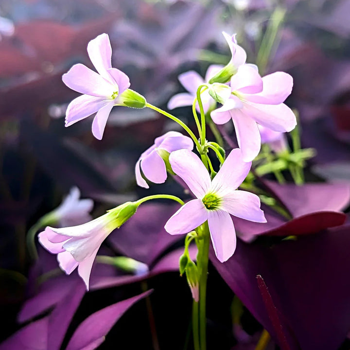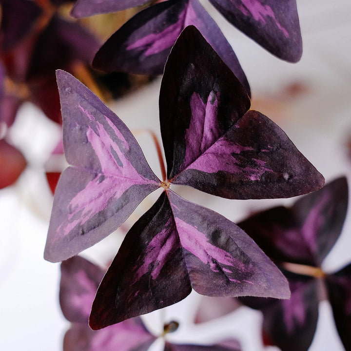 Oxalis triangularis, commonly known as the Purple Shamrock, is a stunning perennial plant with uniquely shaped, vibrant purple leaves that close at night and reopen in the morning. Its delicate flowers, ranging from soft pink to white, create a charming contrast against the foliage. This versatile plant is a favourite for borders, pots, and indoor displays, adding year-round interest to your garden or home.