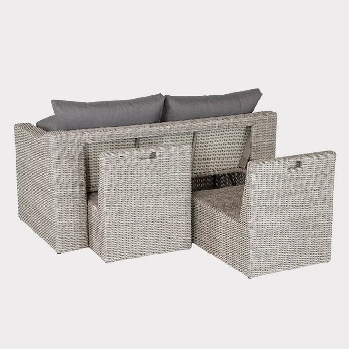 Crafted with an aluminium frame and hand-woven 5mm half-round weatherproof synthetic weave, the Palma Compact Set is as durable as it is stylish. Available in a chic whitewash finish with grey taupe cushions, this set offers a timeless aesthetic that complements any outdoor décor. One of the standout features is the space-saving design: the chairs neatly slide into the back of the sofa when not in use, and the cushions can be conveniently stored in the included storage box.