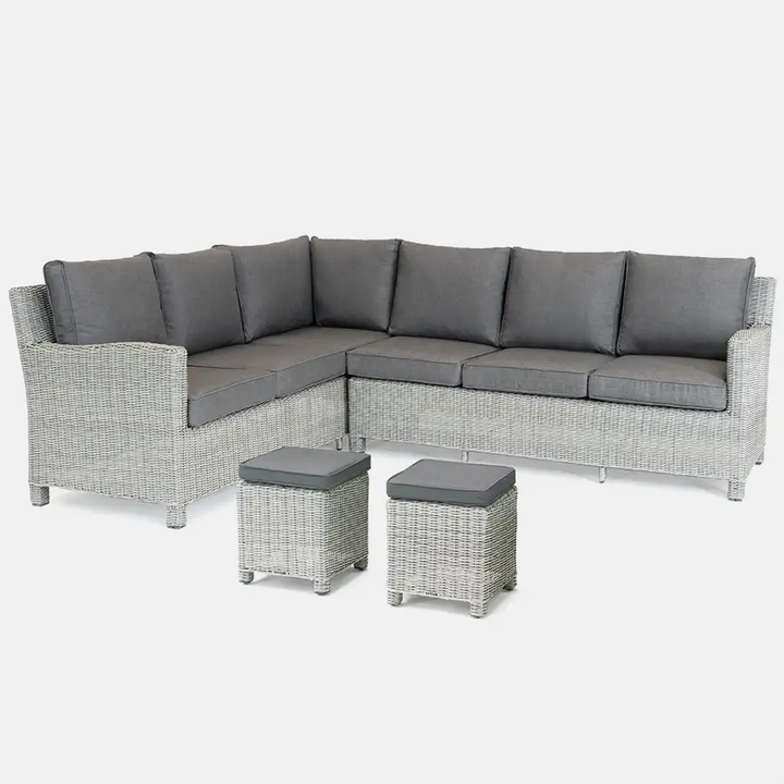The Palma Corner Sofa Set in Whitewash rattan exudes a sophisticated charm, seamlessly complementing any outdoor space. The soft Grey Taupe cushions offer a plush contrast, ensuring your guests feel comfortable. For added versatility, the set includes two matching stools—ideal for extra seating or as footrests.