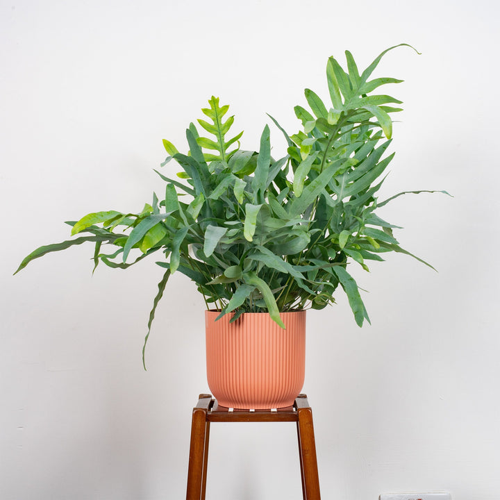 Phlebodium Blue Star is an indoor Fern plant which has some more lush and clean foliage in comparison to other Ferns. Each leaf is elongated and still has that drooping nature about them to create that look of the classic Fern, however, the droop is less noticeable on the Bue Star. More commonly known as the Golden Polypody, you should place this plant in areas where you can guarantee the plant regular access to light shade. Then, when watering, you should make sure to do this once every two weeks, whilst misting the plant in between waterings. Always water the Blue Star from the side and not directly onto the plants fronds.