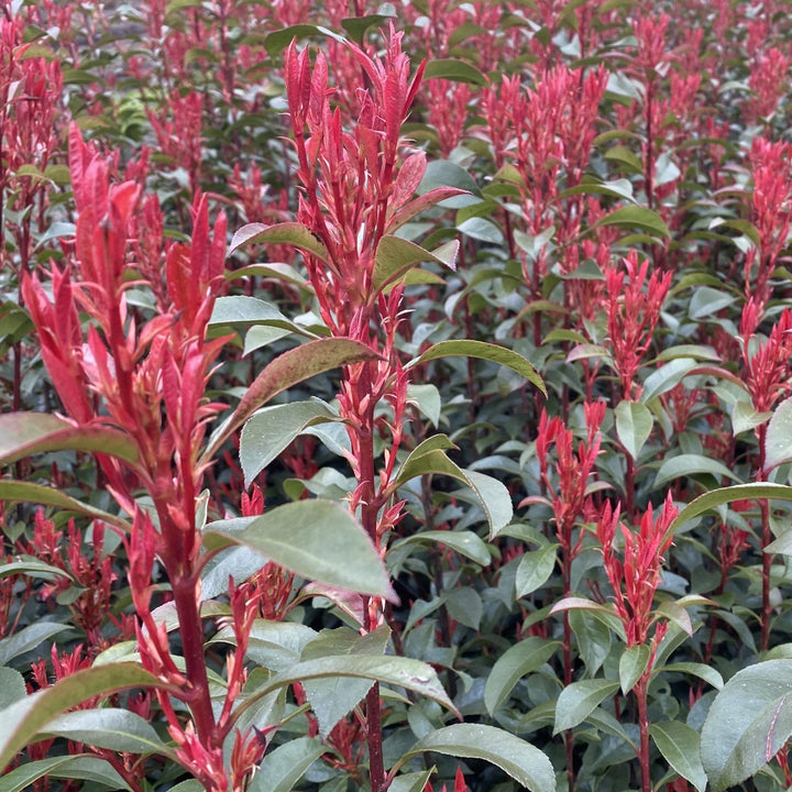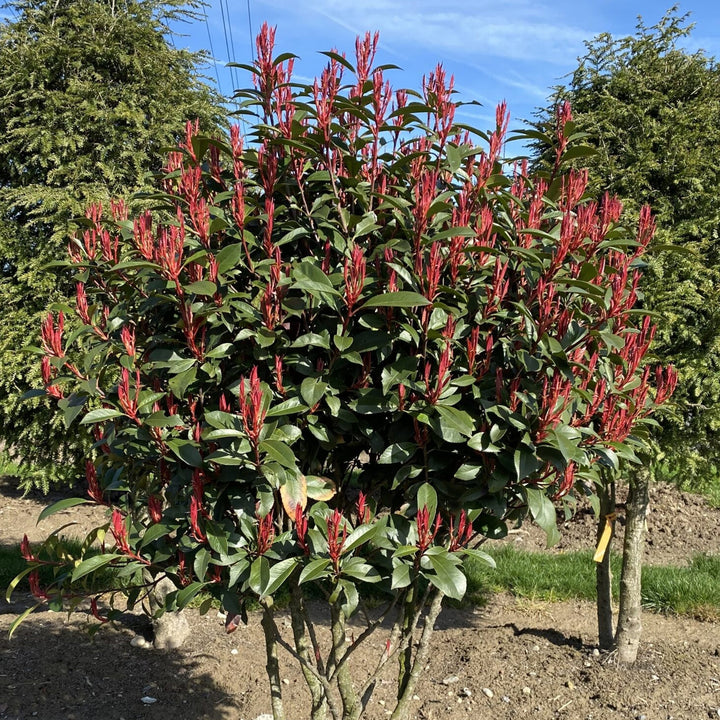 The Photinia 'Carré Rouge' is a wonderful addition to the garden as a patio tree or vibrant focal point. The foliage is red when young and progresses into a dark green over time. The evergreen nature of the tree allows the tree to have year-round interest, as well as a lovely flowering season in Spring when an array of creamy-white flowers bloom. This variety brings beauty in all areas, enhancing any outdoor space you place it in.