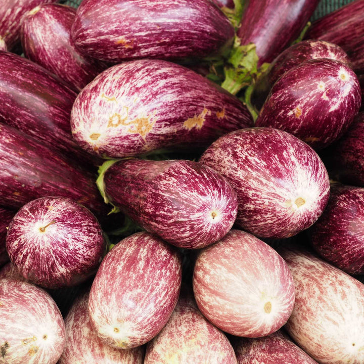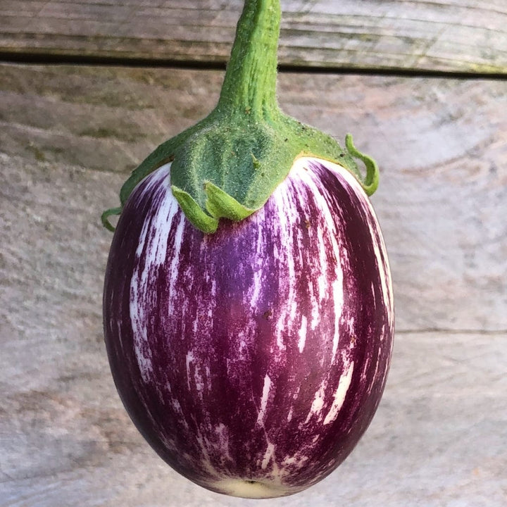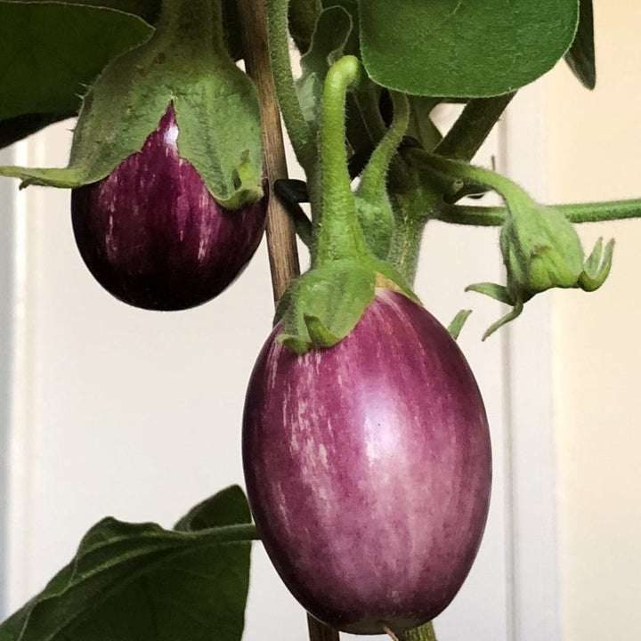 - A compact dwarf variety of aubergine with distinctive purple and white stripy fruits