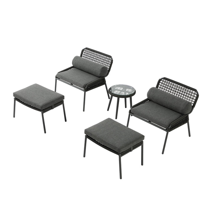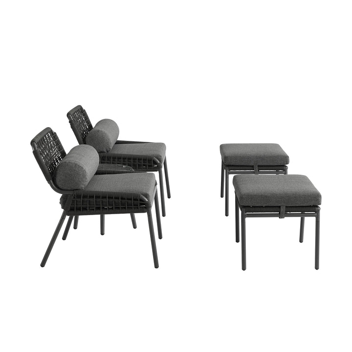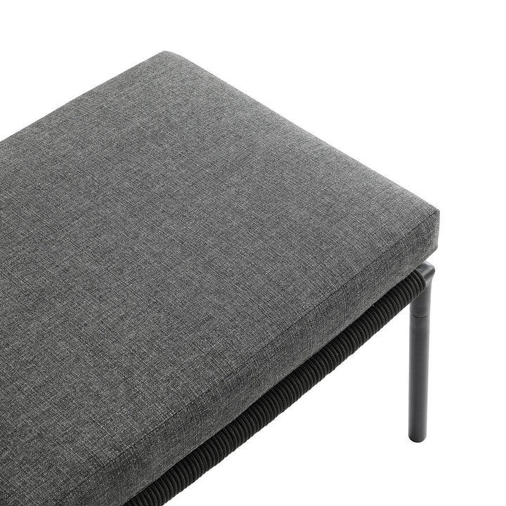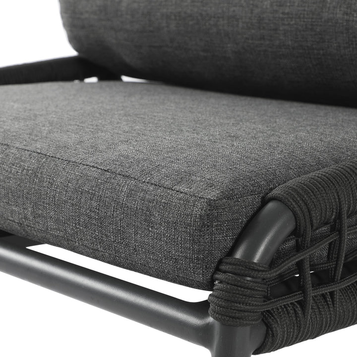 - Weather resistance dark grey woven fabric upholstery complements the dark grey rope and matte black frame for a simple elegant look