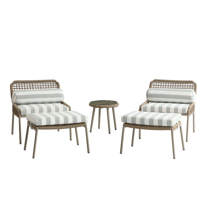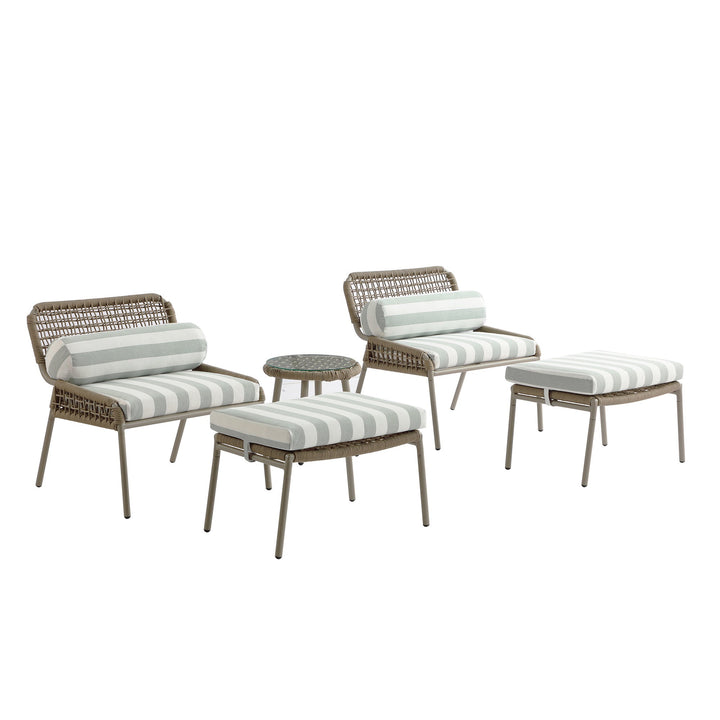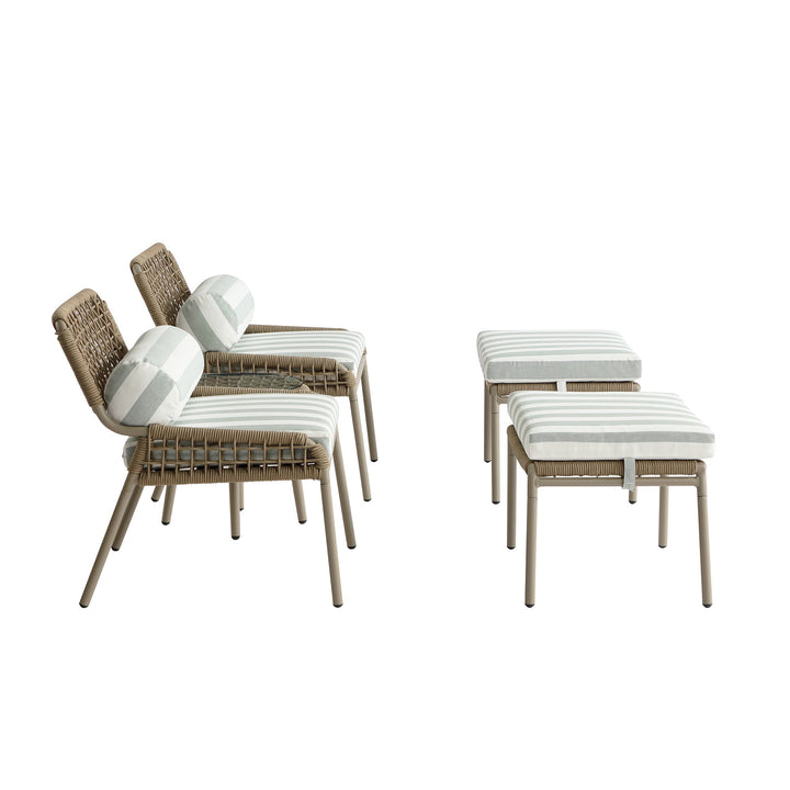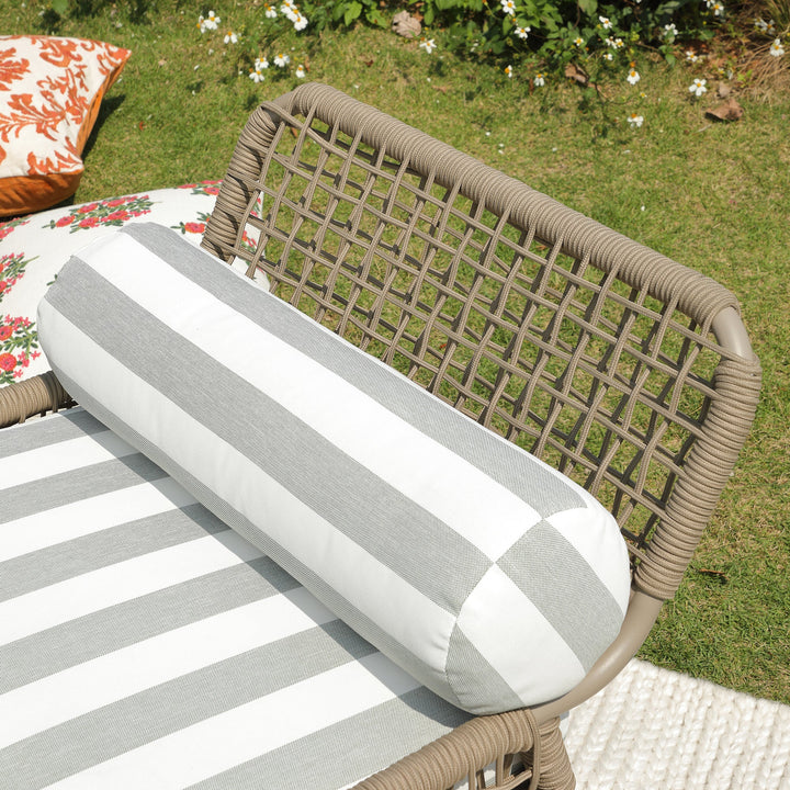- Beautiful sage striped weather resistance fabric upholstery coordinates the taupe rope and frame for a fresh, contemporary look.