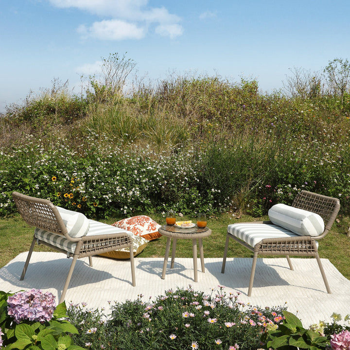 - Complete the look: Pictured with the Pomona Rope Weave Bistro Set, Sage Striped Fabric with Taupe Frame, is our Aurora Cream Outdoor Hand Braided PET Rug., and our Indra Mughal Sundance Yellow Wool Embroidered Cushion.