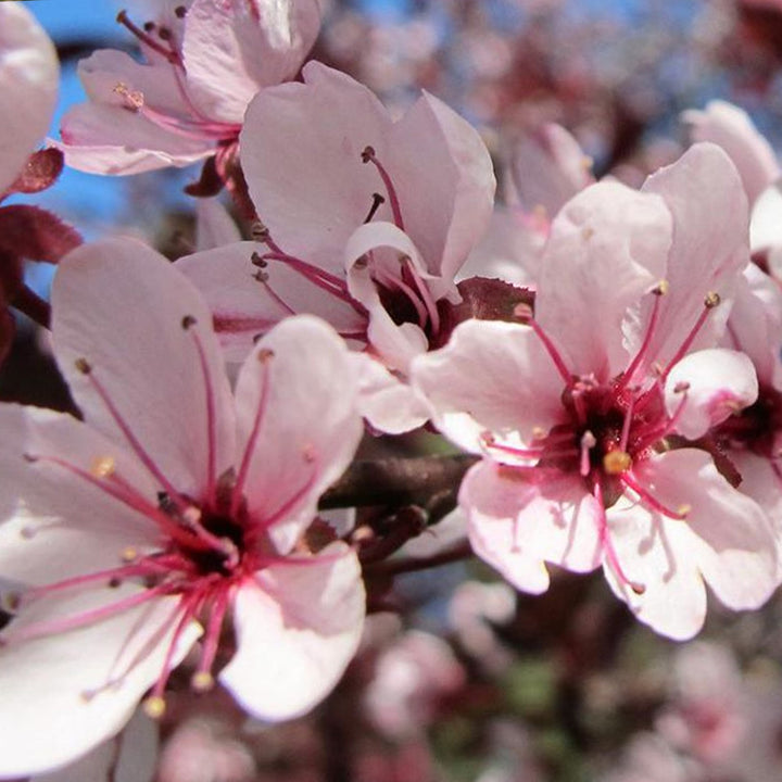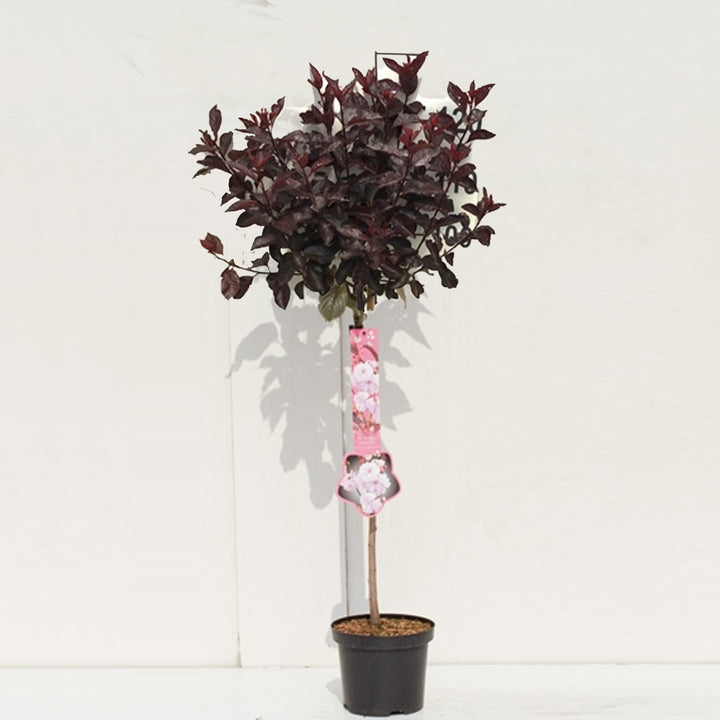 Prunus Cistena are deciduous ornamental trees with colourful foliage and attractive flower blooms that develop in spring. New foliage appears in a shimmering purple colour. In autumn, the leaves offers a striking display of fiery orange and bronze, before they fall towards winter. In winter and in regions that get really cold, any snowfall enhances the tree making the branches look stunning, iced in white. The flowering cherry tree offers a wonderful eye-catching display of double petal deep pink flowers in spring, April to May, clustering on the branches.