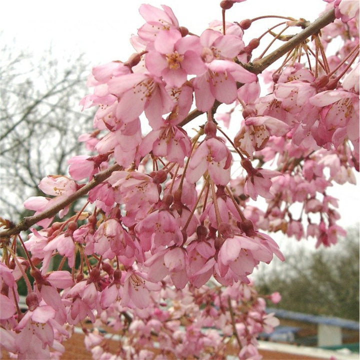 Prunus subhirtella 'Pendula Rubra' is a slow-growing upright tree with horizontal main branches and long, thin branches that hang down strongly. Also known as the Japanese Hanging Cherry, this upright growing deciduous shrub reaches a height of about 4 m in ten years. Its overhanging branches are covered with flowers in summer from late March to early April. This spectacular display is why people love this Japanese native cherry.