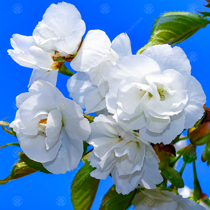 Very striking flowering Cherry tree that offers a fabulous display of large, double white flowers in April and May. The clusters of flowers are smothered on the branches, drooping downwards against a backdrop of dark green leaves. This picture-perfect tree is a must-have for your garden! In autumn the leaves turn to a vibrant crimson, orange and yellow hues before falling. It has a attractive chestnut bark that becomes silvery with age.