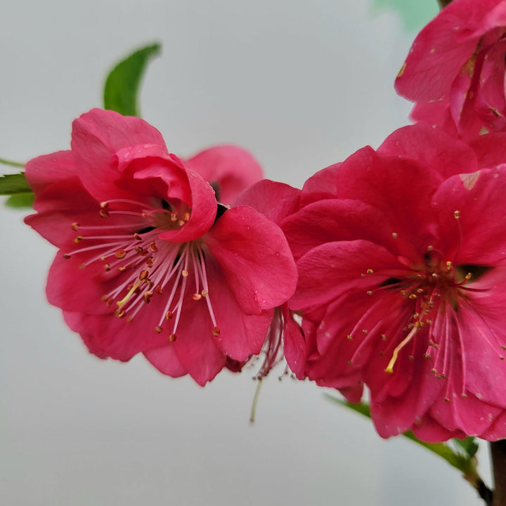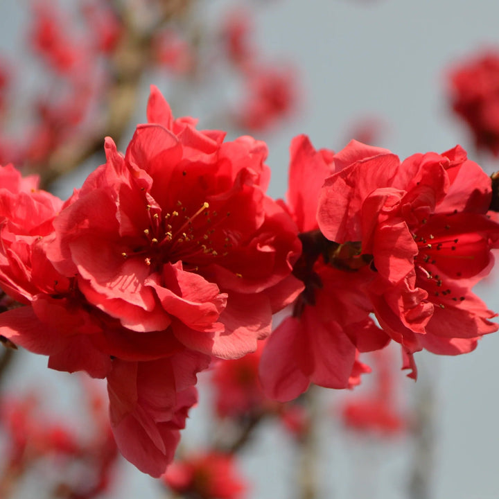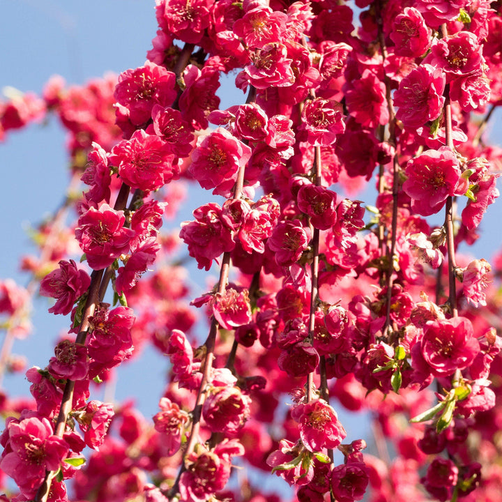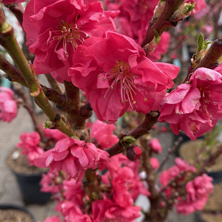 Prunus Red Peachy Patio Trees are small, deciduous garden trees which boast masses of beautiful blossoms throughout the spring months. These blossoms are similar in appearance to cherry blossoms, although the colour is a much more vibrant shade of stunning peachy red. In summer, slender green leaves are accompanied by small, plump fruits which are not edible.