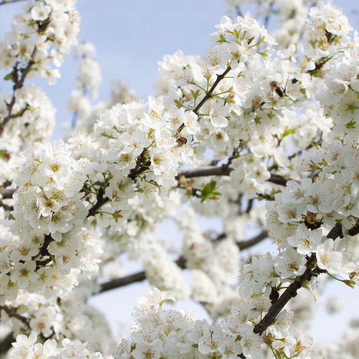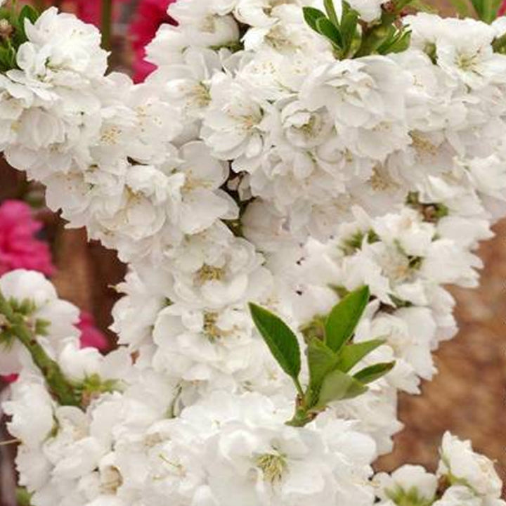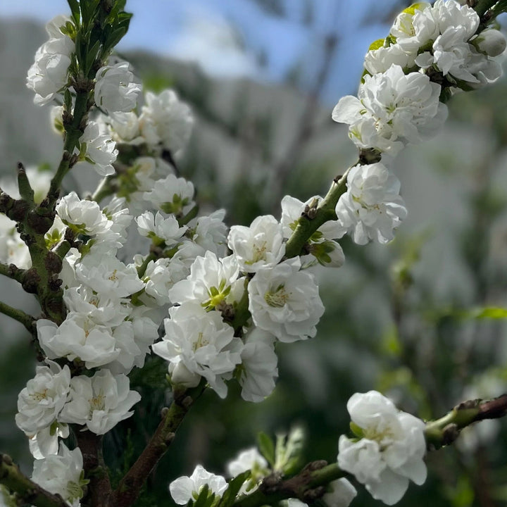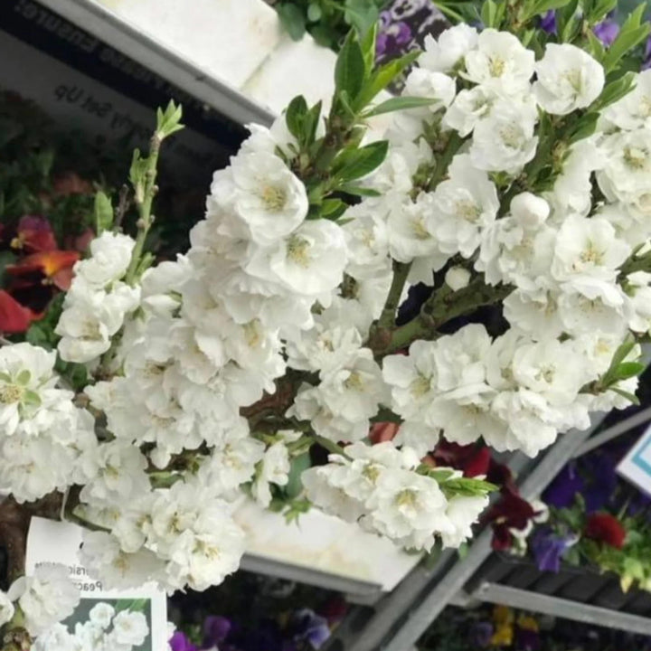 Prunus White Peachy Patio Trees are small, deciduous garden trees which boast masses of beautiful blossoms throughout the spring months. These blossoms are similar in appearance to cherry blossoms, but rather than soft pink, they are pure white in colour. In summer, slender green leaves are accompanied by small, plump fruits which are not edible.