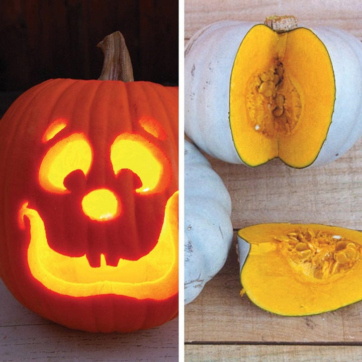 Crown Prince F1 - Unmistakable with its blue-grey skin, its sweet, orange flesh is totally delicious. Yields pumpkins up to 4kg(9lb) which keep if stored cool.