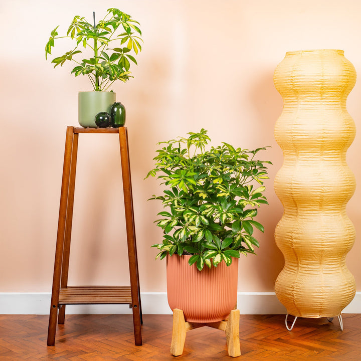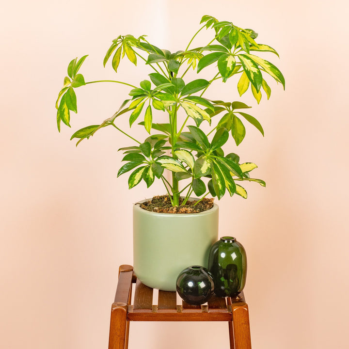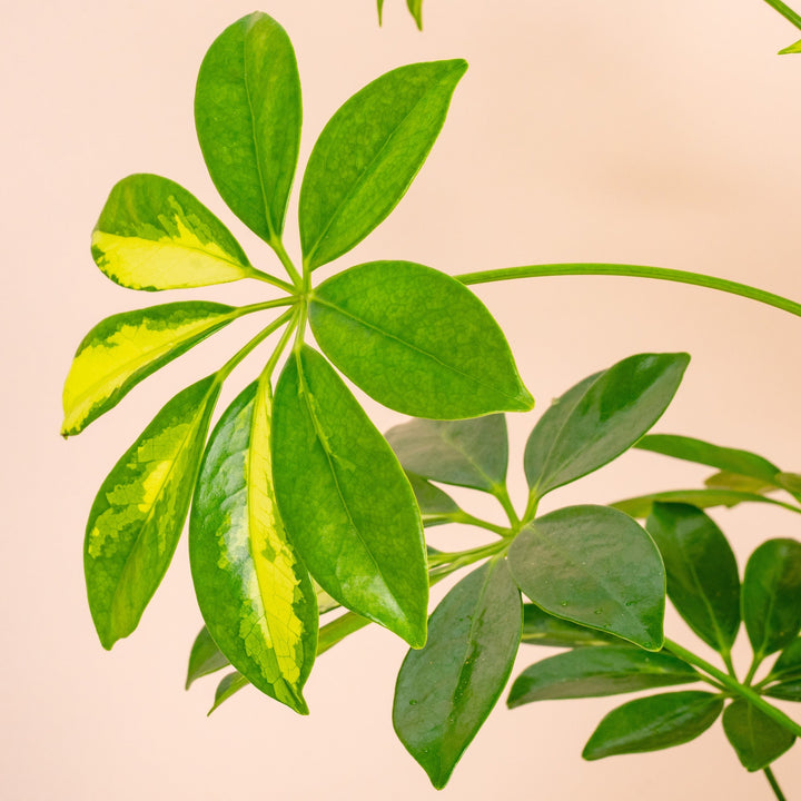 The Schefflera Gold Capella is a stunning and unique houseplant that is sure to make a statement in any space. This cultivar of the Schefflera plant features glossy, green leaves with delicate, bright yellow variegation, giving it a very striking appearance. The Schefflera Gold Capella is a low-maintenance plant that is easy to care for, making it a great choice for those who are new to gardening or who have busy lifestyles. It thrives in bright, indirect light, making it perfect for placement near a sunny window, but it can also tolerate lower light conditions. It prefers to be watered when the top inch of soil is dry to the touch, but it's important not to overwater, as this can cause root rot. With its upright growth habit, the Schefflera Gold Capella can grow up to 4-5 feet tall, making it a great choice for adding a touch of height to your indoor garden. It can be used as a standalone plant or as part of a larger arrangement. The Schefflera Gold Capella is also an air-purifying plant, meaning that it can help to remove toxins and impurities from the air, improving the air quality in your home or office. This makes it an ideal choice for those who suffer from allergies or respiratory issues. Overall, the Schefflera Gold Capella is a beautiful and eye-catching houseplant that is sure to bring a touch of elegance to any space. Its unique variegation and low-maintenance care requirements make it a great choice for both novice and experienced gardeners alike. Whether you're looking to add a pop of colour to your home or office, or simply want to enjoy the beauty of nature indoors, the Schefflera Gold Capella is an excellent choice.
