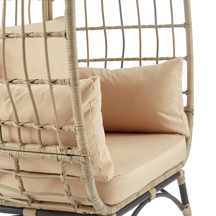 - The cocoon seat is supported by sturdy fixed metal legs, wrapped with matching rattan weaves.