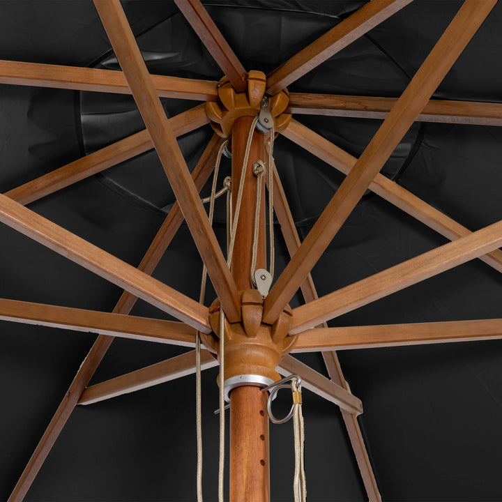 The Styx 3m X 2m Rectangular Deluxe Wooden Parasol in Black is a sturdy parasol that is easy to use thanks to the simple double pulley rope system.