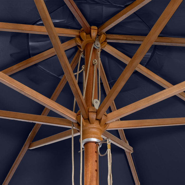 The Styx 3m X 2m Rectangular Deluxe Wooden Parasol in Navy is a sturdy parasol that is easy to use thanks to the simple double pulley rope system.