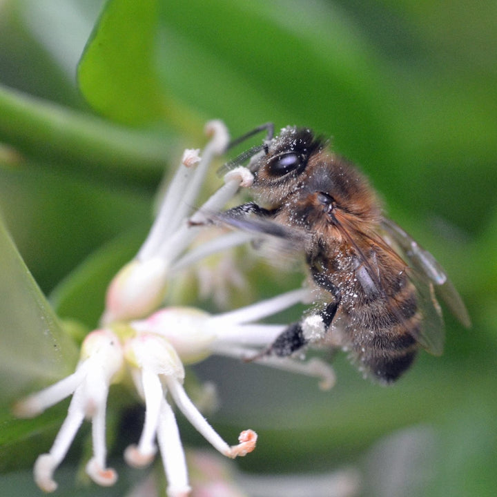 - Deep green wavy leaves with sweetly scented creamy white flowers in winter, followed by glossy black berries