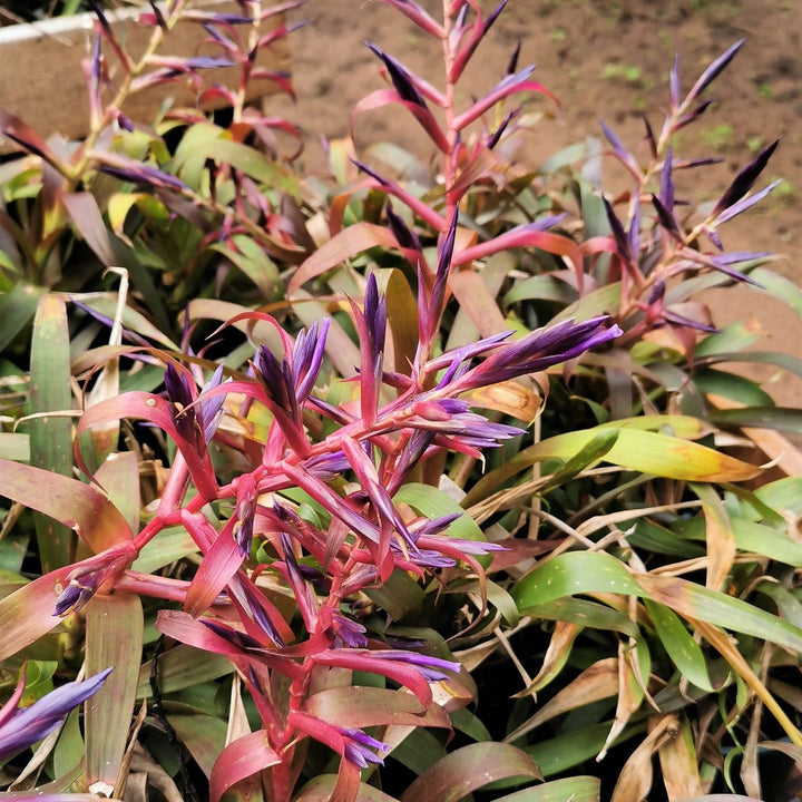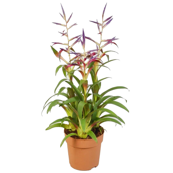 Tillandsia leiboldiana Mora is a perennial cultivar of the Bromeliaceae plant family. This houseplant brings evergreen, year-round foliage and effective flowering to guarantee a standout addition to any home or office. Each leaf is upright and arches outwards at the peak, alongside a central stem that bears small purple flowers and lengthy purple bracts in Summer. This variety will also reach an ultimate height of 0.6m and spread of 0.4m.