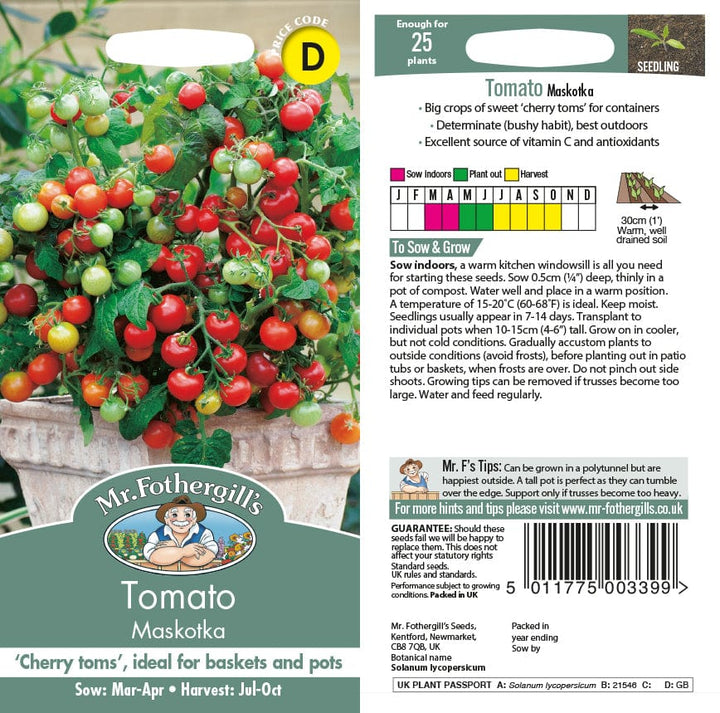 Add a burst of flavour to your kitchen garden with our Maskotka tomato seeds. Order now to enjoy these sweet, tangy fruits, perfect for snacking, salads, or adding to your favourite recipes. Pair them with our cucumber seeds and chilli seeds for a thriving kitchen salad garden, or explore our full range of vegetable seeds for more tasty additions to your garden.