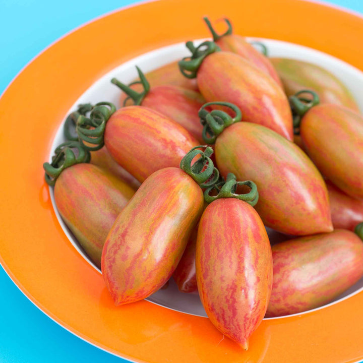 Tomato ‘Pink Tiger’ produces abundant harvests of plum tomatoes streaked with red and gold stripes. With their stunning colours and delectable flavour, sweet with just the right amount of acidity, they’re perfect for adding both colour and taste to salads.