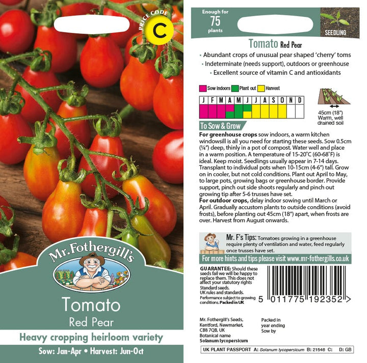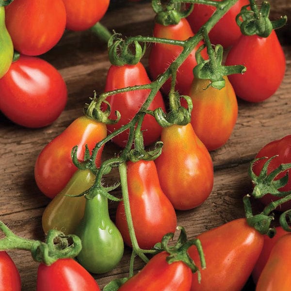 An unusual, fleshy pear-shaped 'cherry' tomato with a wonderfully sweet flesh. Indeterminate. Plants develop generous trusses providing large harvests. Suitable for indoor and outdoor cultivation.