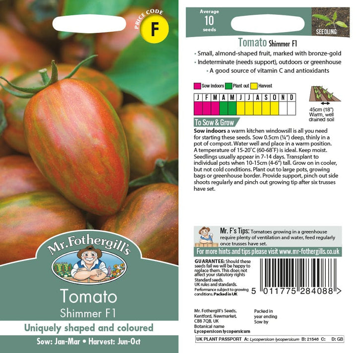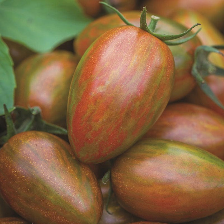 Small, almond-shaped fruit, marked with bronze-gold. A good source of vitamin C and antioxidants. Indeterminate (needs support), outdoors or greenhouse.