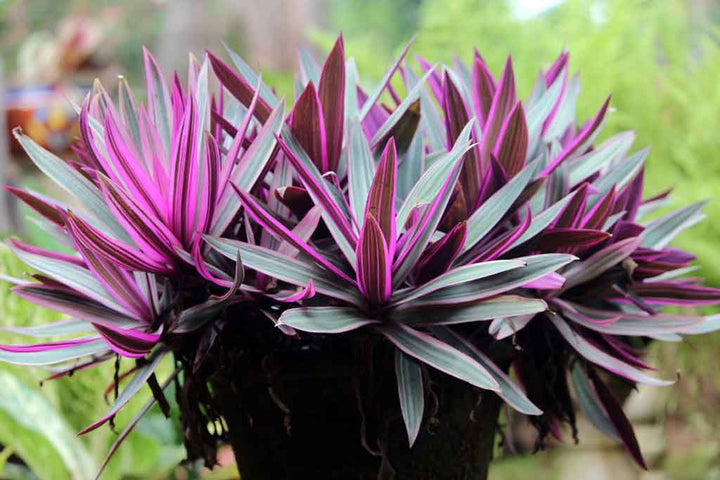 The Purple Inch Plant is a striking houseplant that will add colour to any room. Their variegated leaves add pattern and distinction to the plant, with its purple, green and white coloured leaves. The evergreen grass-like leaves arch from the plant and will last all year round.