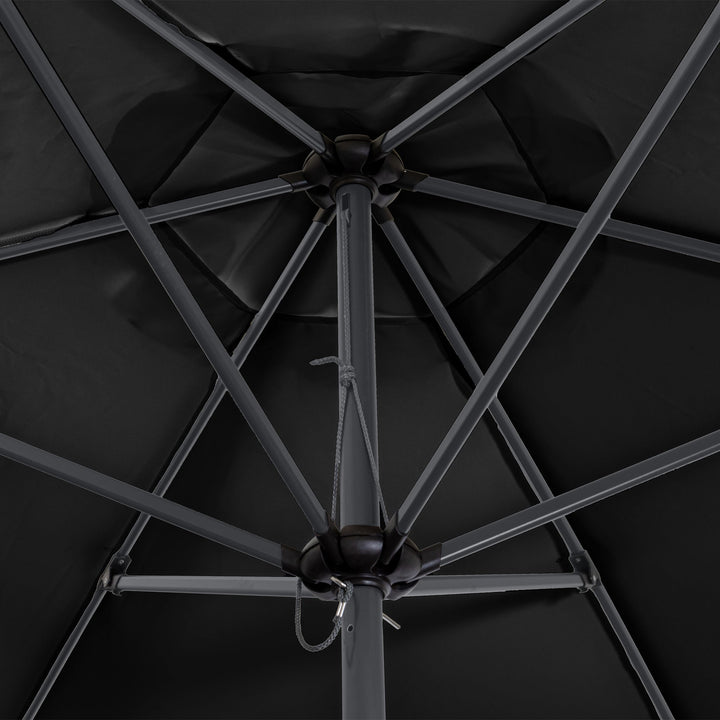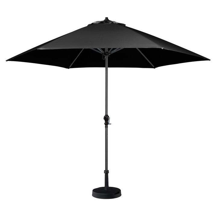 The Triton 2.5m Aluminium Parasol in Black, operated by a crank handle system that can be used with either a Dining Table or as a free standing parasol.