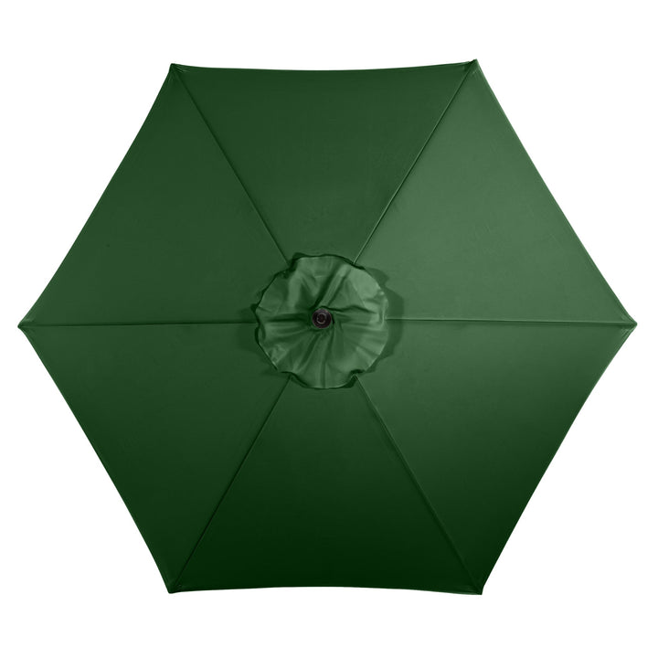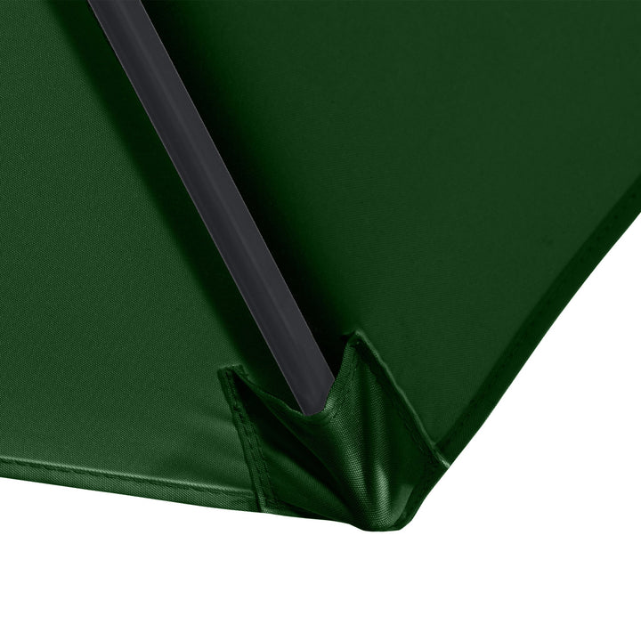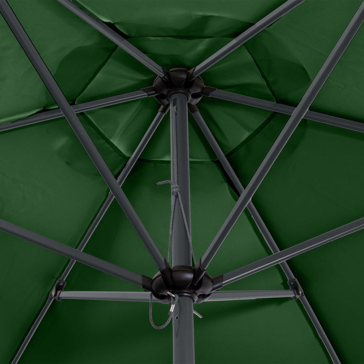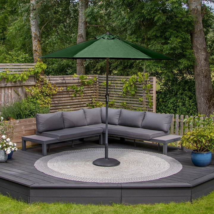 The Triton 2.5m Aluminium Parasol in Green, operated by a crank handle system that can be used with either a Dining Table or as a free standing parasol.