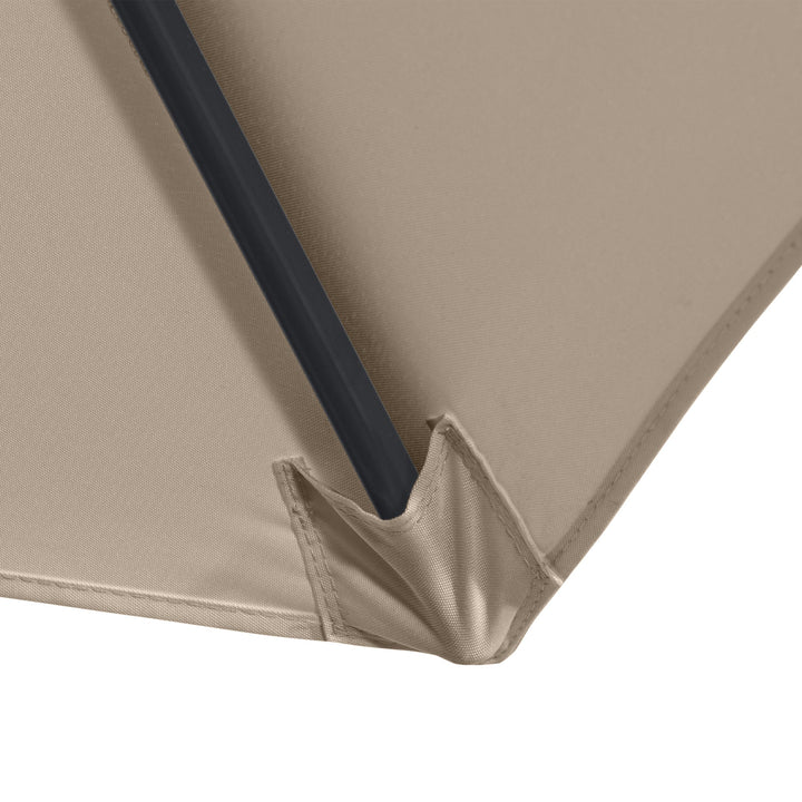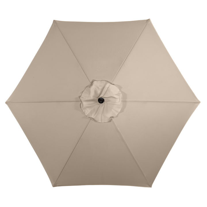 The Triton 3m Aluminium Parasol in Khaki, operated by a crank handle system that can be used with either a Dining Table or as a free standing parasol.