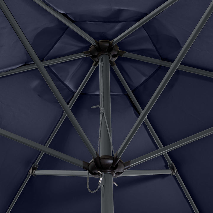 The Triton 3m Aluminium Parasol in Navy, operated by a crank handle system that can be used with either a Dining Table or as a free standing parasol.