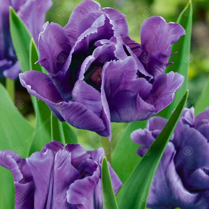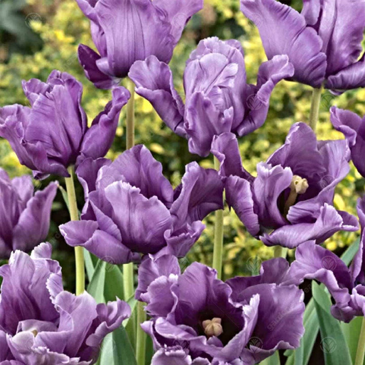 Blue Parrot is a division 10, Parrot Tulip with deep violet-indigo shades in the petals with fascinating frilled margins. Blooms appear on long, tall stems and thrust the flowerheads skyward for all to appreciate their beauty and showiness.