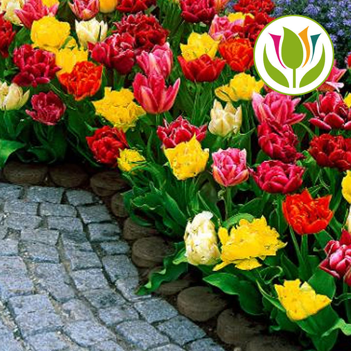 Double Early Mixed Tulips provide a wonderful display of colour. The flowers are made up of dozens of petals arranged in a whorl around the centre. If the bulbs are not spaced too far apart, the opened flowers will touch and will form the most spectacular display, a perfect carpet of spring flowers.