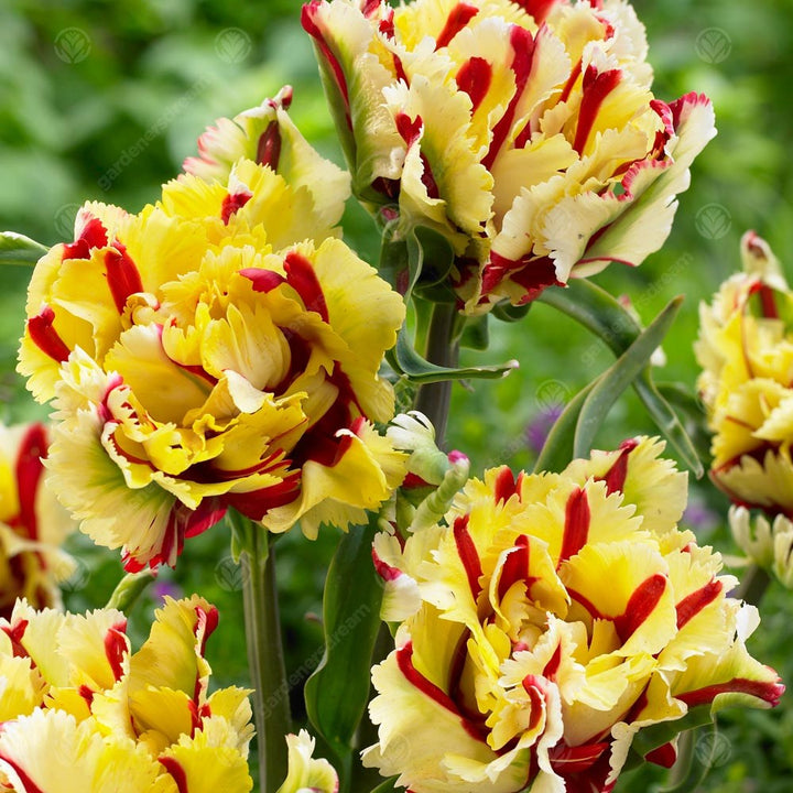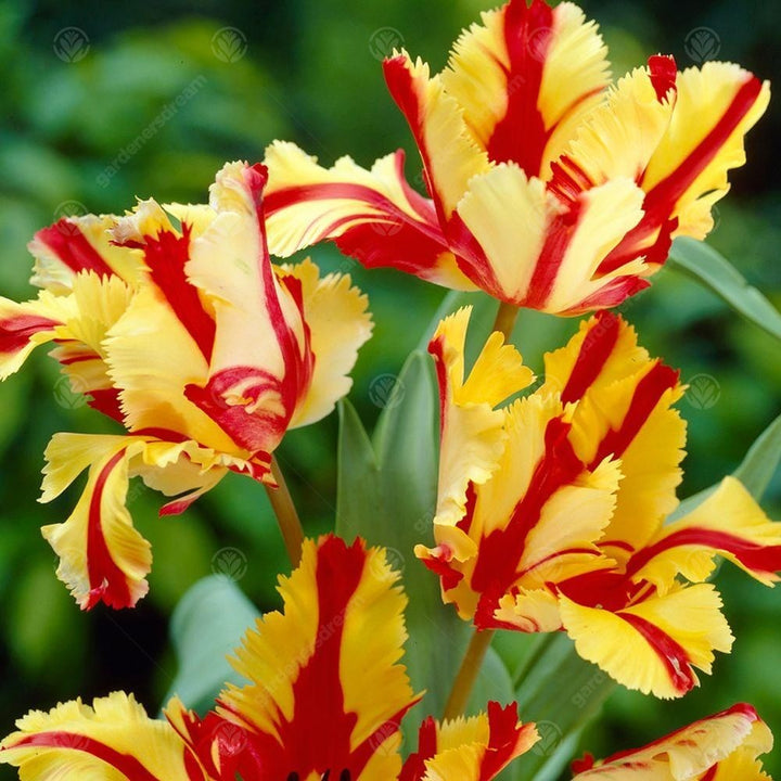 Flaming Parrot is a division 10, Parrot Tulip that contrasts a central, bright crimson rib with golden yellows towards the exterior of the petals. Looking into the bloom is like a merry-go-round kaleidoscope with yellows and reds swirling into one another.