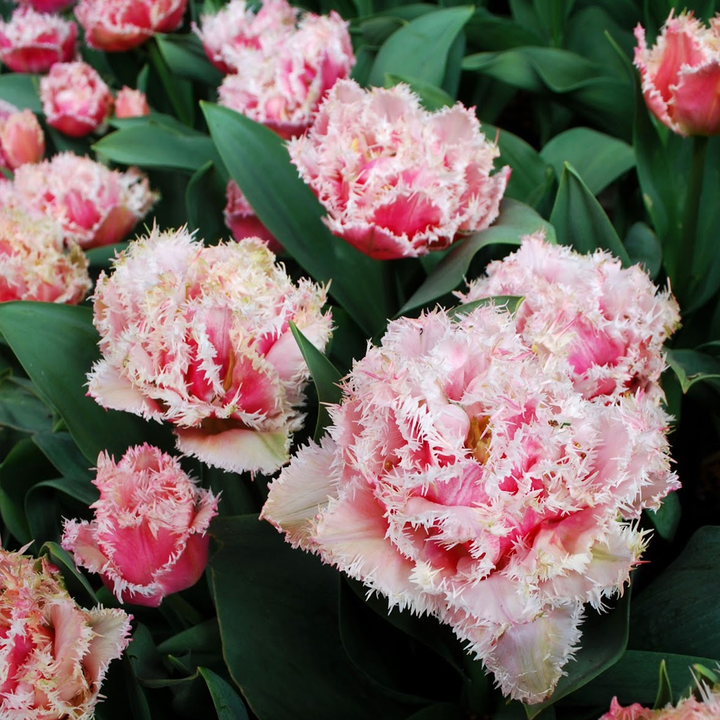 Exceptionally pretty and long-lasting, Tulip 'Queensland' is a fabulous double flowering tulip variety full of reddish-pink ruffled flowers with finely incised white edges atop broad lance-shaped leaves. Blooming in mid-late spring, this spectacular member of the Fringed Tulips group enjoys a long stem and will look ravishing in a vase!