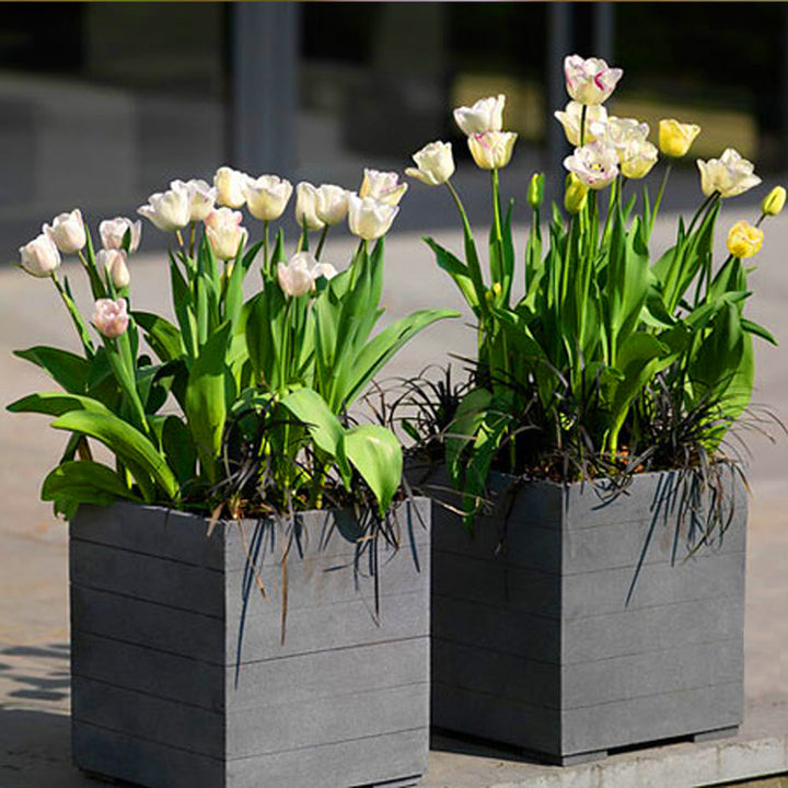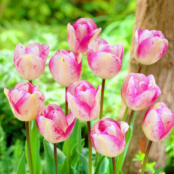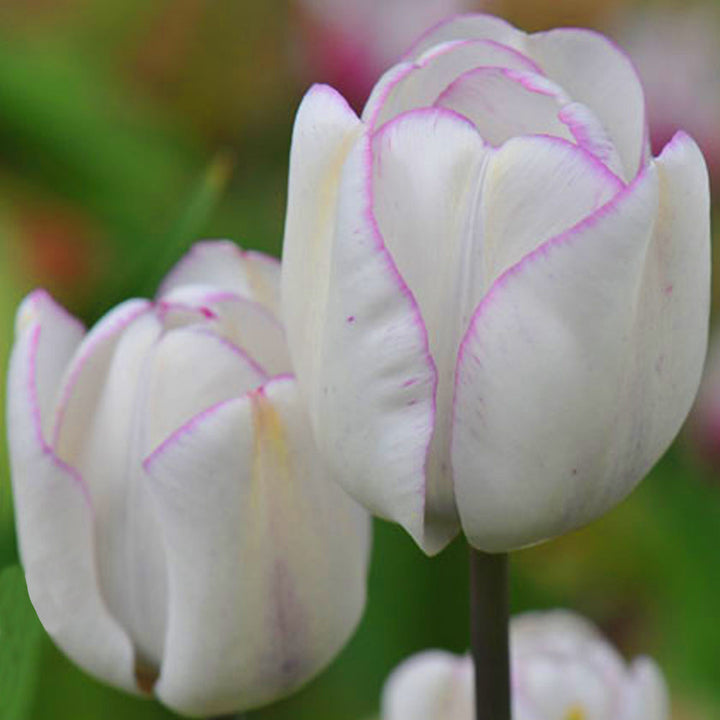 Tulip Shirley is a classic tulip variety, beginning life as an ivory white to slightly yellow with a delicate purple margin. As Shirley matures, the purple margin spreads and fades into a purple to pink blush all over the flower. Standing atop tallgrey-green stems and decorated with lance-shaped foliage, Shirley is a real show stopper which provides a range of different looks throughout its lifetime. For a spectrum of purple shades, we recommend planting Shirey with the deep maroon Queen ofNight, the bright purple Negrita and the white flamed purple Zurel.