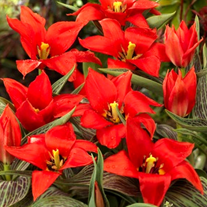 'Showwinner' is a compact bulb to 20cm in height, with broad, light green leaves mottled with purple, and solitary scarlet flowers feathered with cream around the margin on the outside