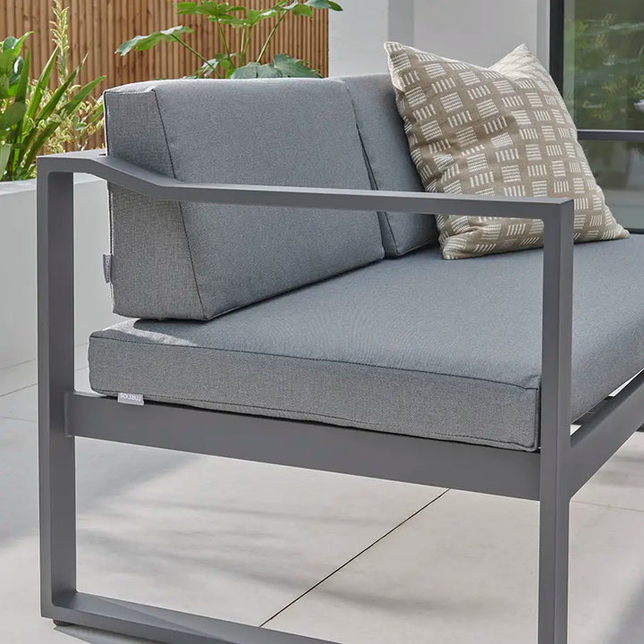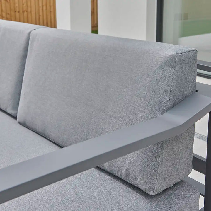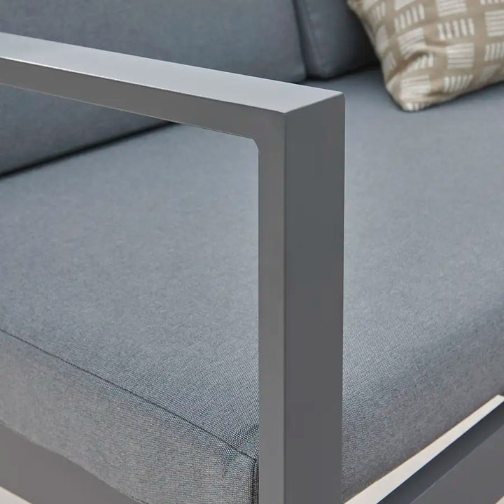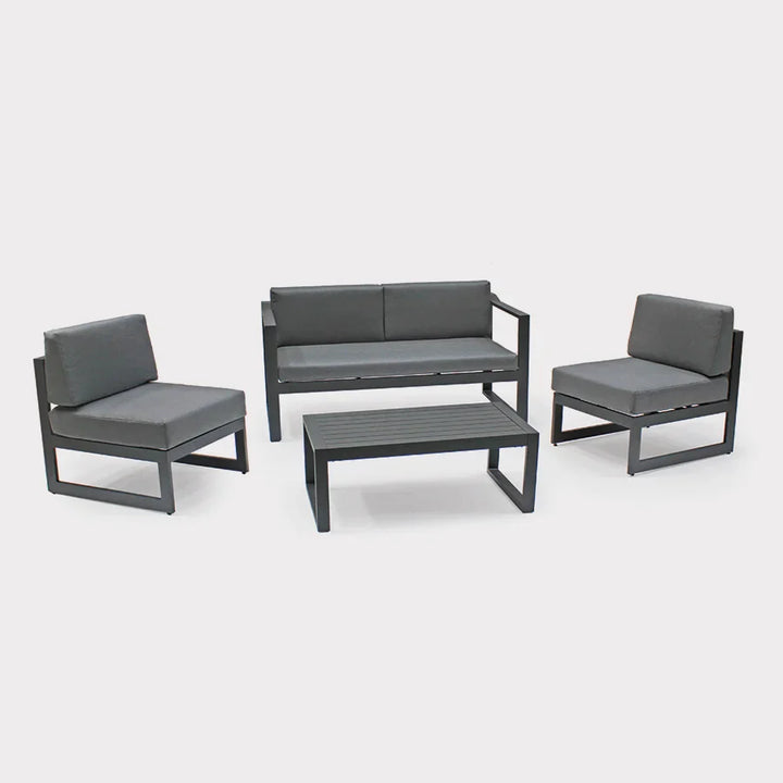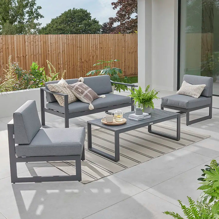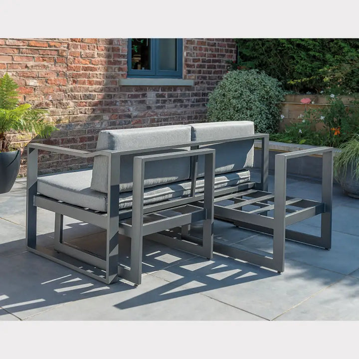 The compact Versa Sofa set is ideal for the modern garden, particularly if you are short on space, as the 2 lounge chairs can be stored under the sofa when not in use. The stylish Sofa set is made to last with a sturdy aluminium frame, which is weatherproof and rustproof. The matching coffee table is also made with hard-wearing aluminium and has a slatted tabletop, providing plenty of space for your snacks and drinks. As the Versa Set is completely weather-resistant you can keep it outdoors all year round (except cushions), without it deteriorating or changing colour.