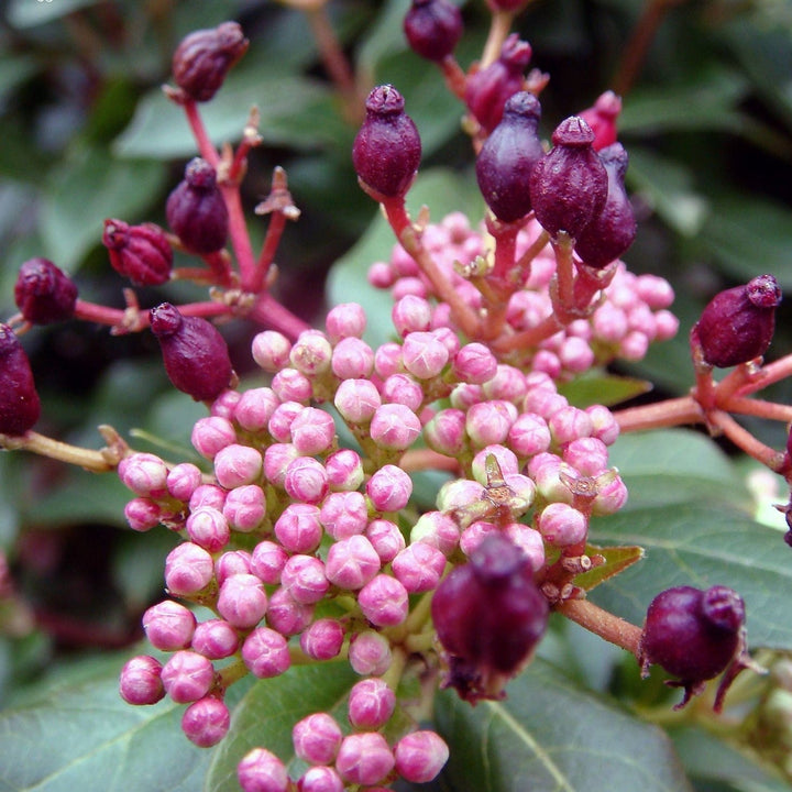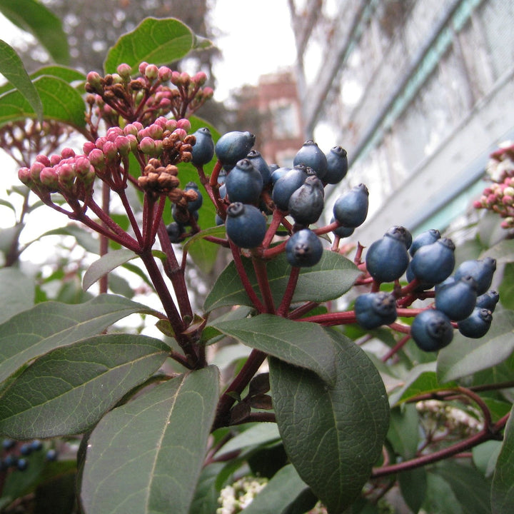 - Dark green ovate foliage with clusters of creamy white flowers, often pink tinted in bud. Flowers throughout late winter and well into spring, followed by blue-black berries