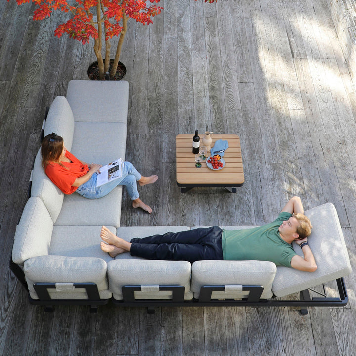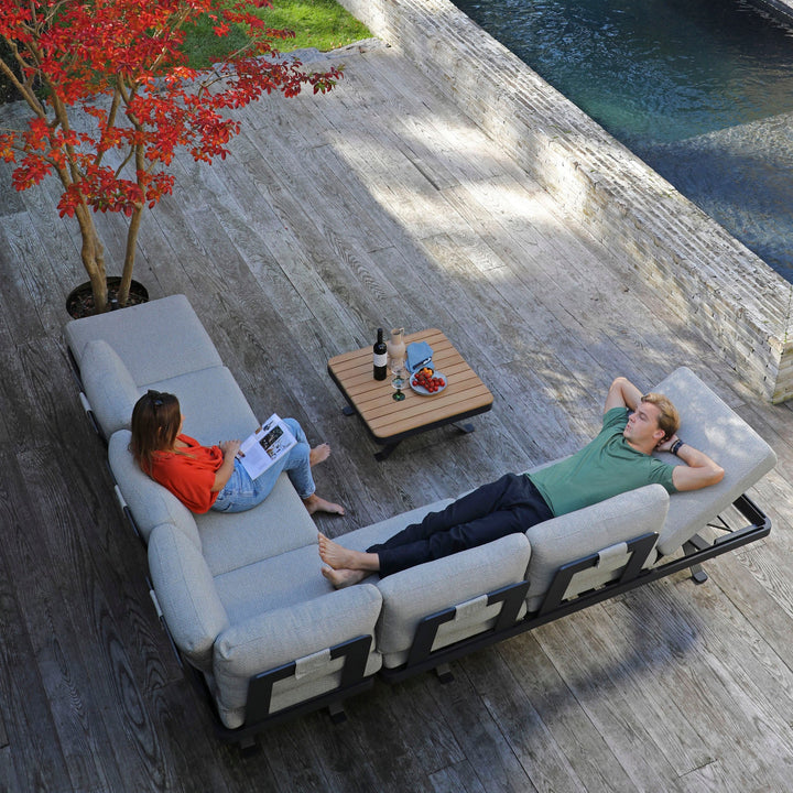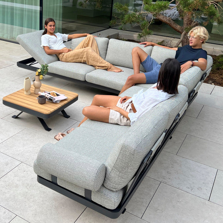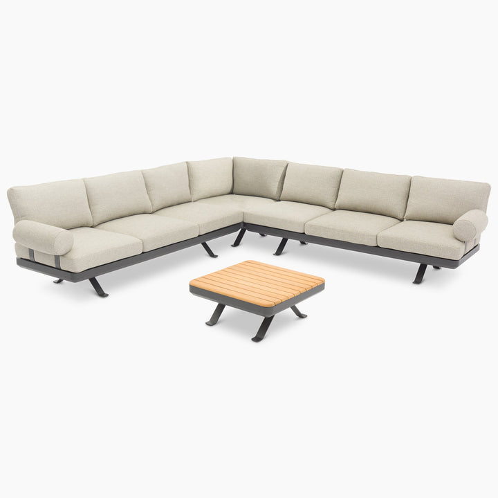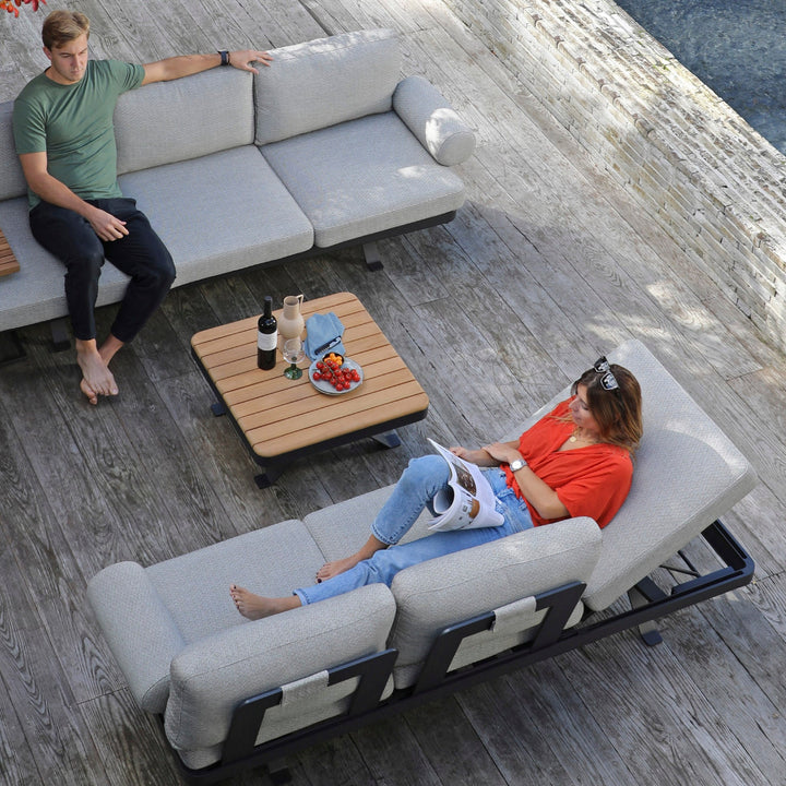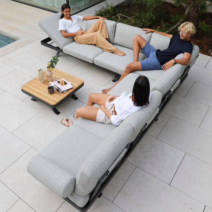 Bring luxury to your outdoor space with this Modular Vienna Corner Group Set in Grey. Featuring a stunning corner group and teak-topped coffee table, its exquisite craftsmanship and high-end materials exude sophistication and style. Enjoy the best of outdoor living with this set that offers both comfort and class.
