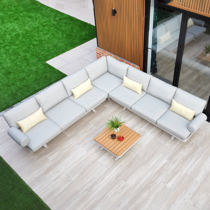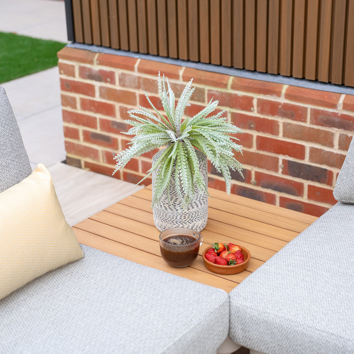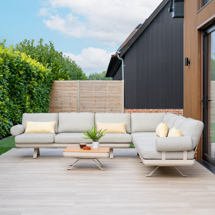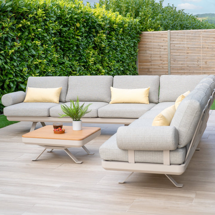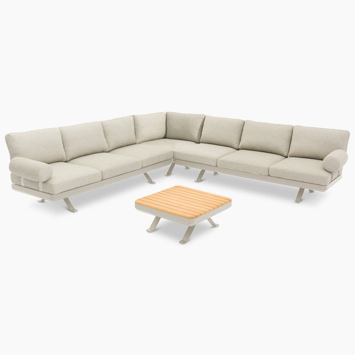 Bring luxury to your outdoor space with this Modular Vienna Corner Group Set in Latte. Featuring a stunning corner group and teak-topped coffee table, its exquisite craftsmanship and high-end materials exude sophistication and style. Enjoy the best of outdoor living with this set that offers both comfort and class.