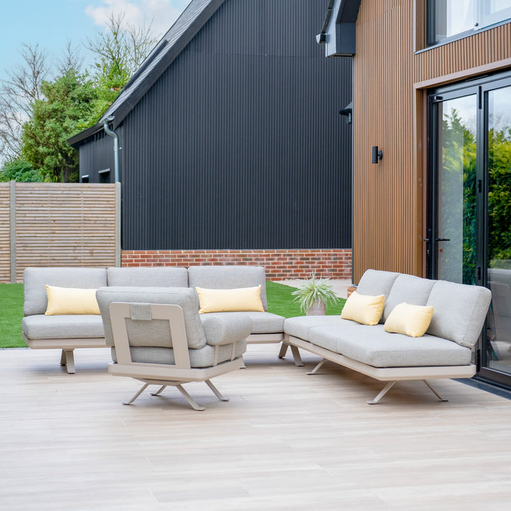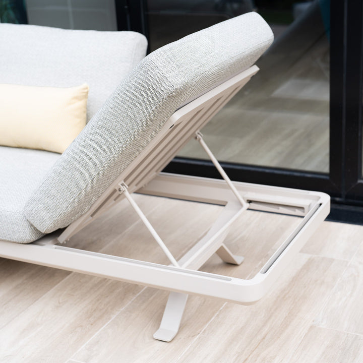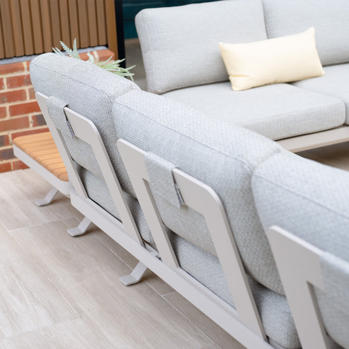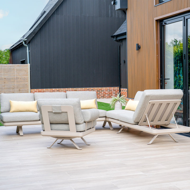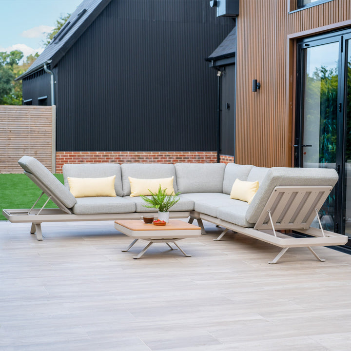 The Vienna Corner Group has been designed to be flexible and modular, allowing you to easily reconfigure your set for any occasion. The Vienna comes with 4 recliners which easily lift up from within the frame, and by removing all the back cushions, the reclining individual sofas can also turn into sun loungers. This corner sofa set comes with bolster cushion armrests for additional comfort that can be removed when using the sunloungers feature and utilised with the footstool and back cushions to create an armchair.
