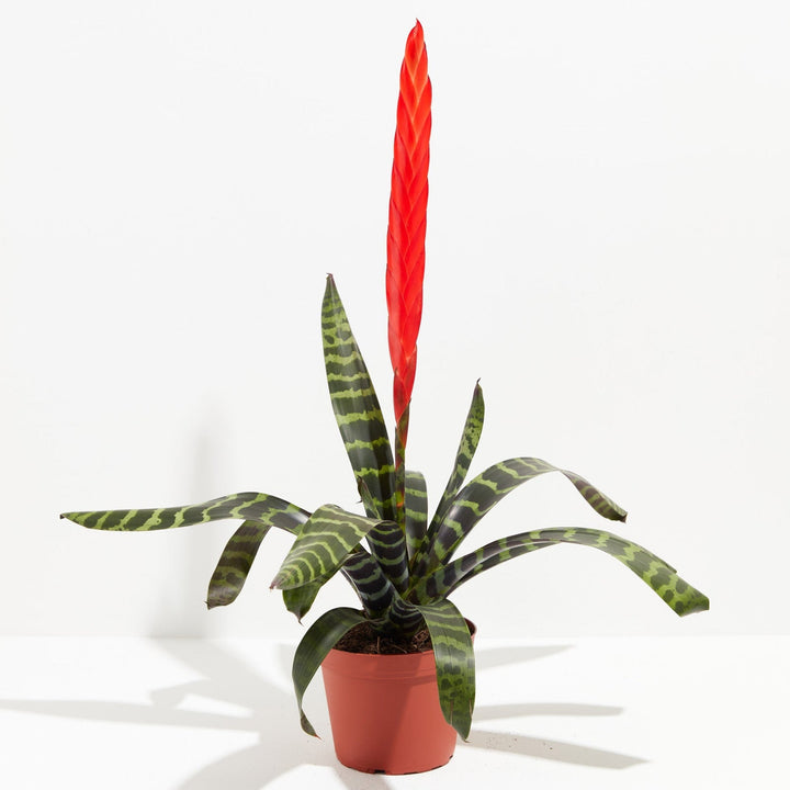 Vriesea Era is a stunning houseplant that is full of pattern and vibrant colour. The evergreen, arching foliage bears a striped maroon and green pattern. This is accompanied by a central, spear-like flowerhead that shows off an eye-catching luminous orange colour when it blooms from Spring through to Autumn. This plant, more commonly known as Flaming Sword, is also a great space-filler as it grows to an ultimate height and spread of 0.6m.