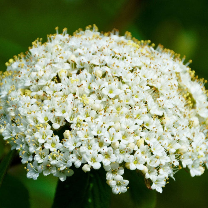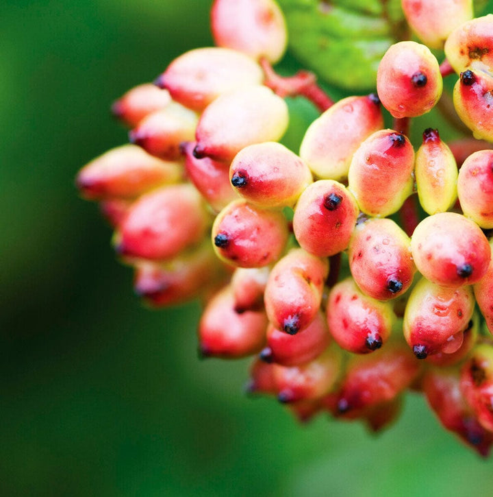 - Large pompom-like heads of white flowers appear in late spring, followed by red berries that ripen to black. The grey-green, toothed leaves turn to scarlet in autumn